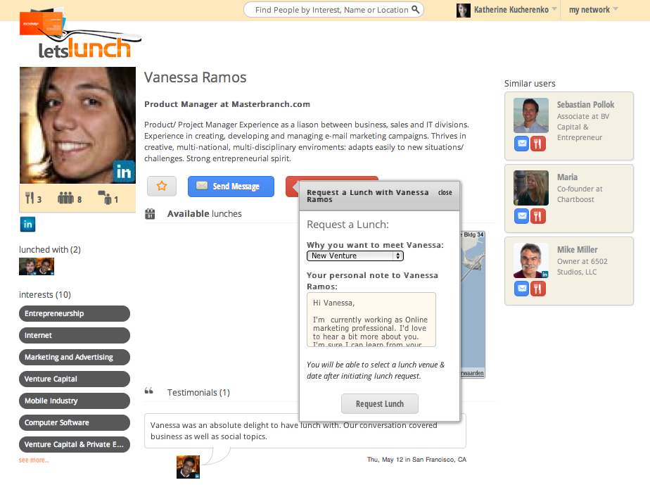 Het idee is een nieuwe manier van netwerken. Letslunch.com maakt het mogelijk om de lunchtijd te gebruiken voor het vinden van zakenpartners, het bevorderen van kennisdeling of simpelweg een gezellige lunch hebben met een relevant persoon. Het platform is zeer toegankelijk: aanmelden kan heel eenvoudig met een LinkedIn-account. Daarnaast kun je instellen wat jouw zakelijke interesses zijn en waar en wanneer je tijd hebt om met iemand te gaan lunchen. Vervolgens word je met iemand gematcht.