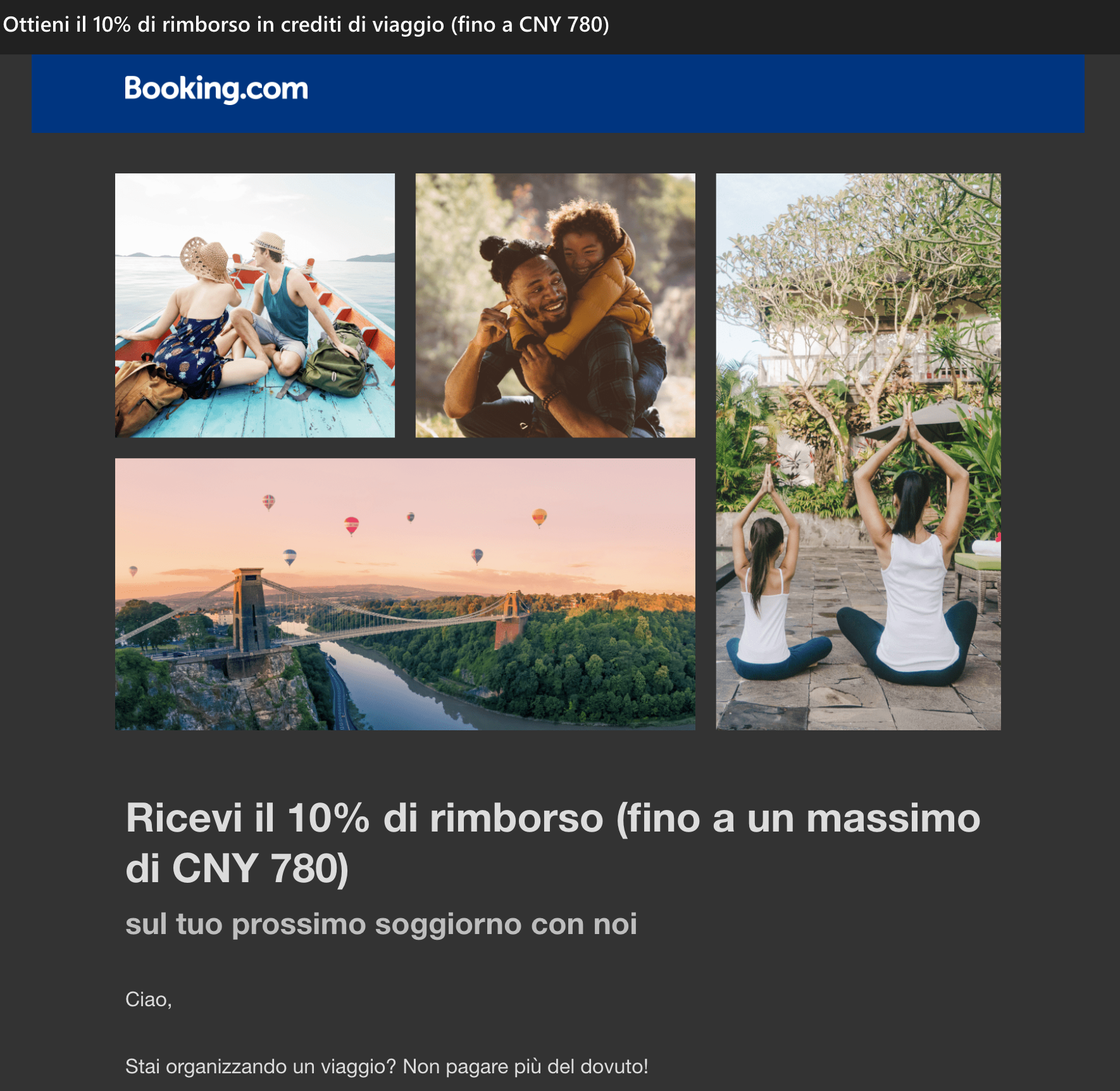 Naast goede timing en boodschap kan goede personalisatie ook lastig zijn. Door het inzetten van dynamische content krijg je weliswaar relevantere life-cycles, maar als het mis gaat dan laat je zien dat je eigenlijk helemaal niet persoonlijk bezig bent. Goed voorbeeld hiervan is een mail van Booking, die ineens in het Italiaans gaat mailen, terwijl ik op de website meestal Engels of Nederlandse interface gebruik. Niet dat dynamische content makkelijk is met veel variabelen, zoals taal, type product, locatie, valuta, toch lijkt het dat er bepaalde regels niet goed doordacht zijn.