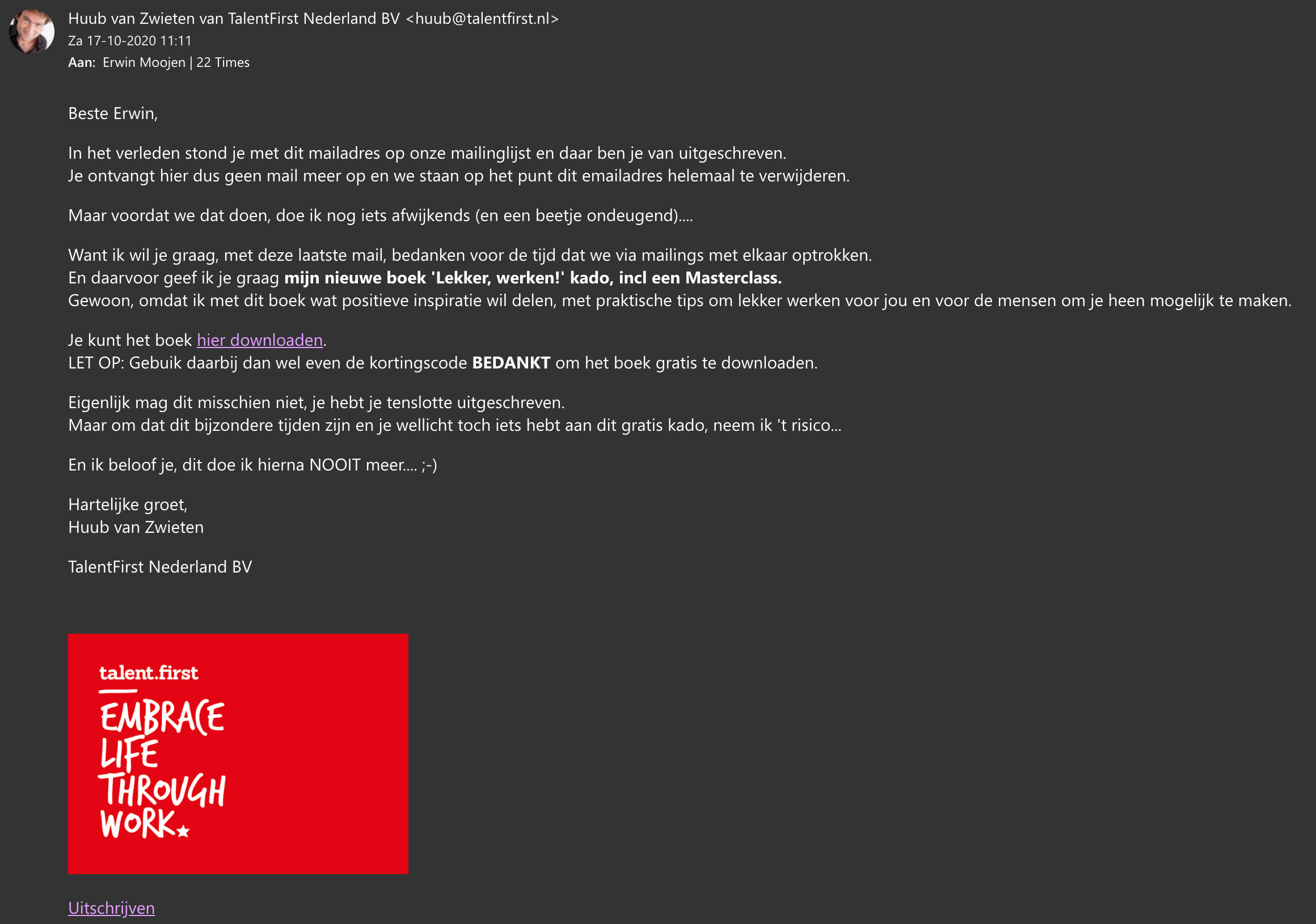Als je duidelijk maakt dat je niet alleen komt halen, maar juist ook wat wilt geven, creëert dat vaak een positieve interactie. En als het vrijblijvend is (en geen sigaar uit eigen doos, zoals een korting toch vaak voelt), dan zorg je voor persuasion door middel van reciprocity (Robert Cialdini). Key hierbij is dat het van waarde is en echt zonder een te verwachten tegenprestatie wordt gegeven. Een goed voorbeeld daarvan kreeg ik pas van TalentFirst in mijn eigen mailinbox, die ik dan ook graag wil delen.