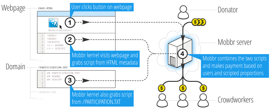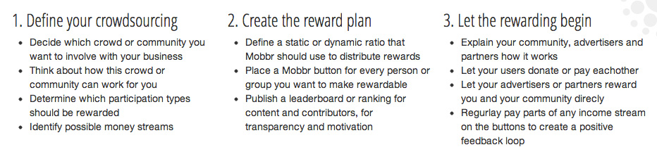 Nu zie je dat dit vooral gebeurt in de vorm van microtasking (bv. Mechanical Turk, Clickworker, etc) of op basis van vrijwilligheid. In de toekomst zullen steeds complexere taken steeds vaker betaald worden uitbesteed. En daarvoor is een betaalsysteem nodig dat die complexiteit aankan: Mobbr.
