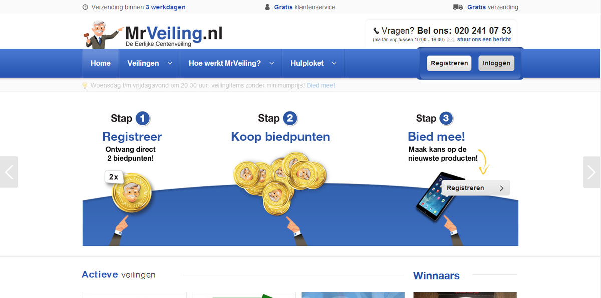 Zo hebben wij een telefoonlijn opgezet die dagelijks bereikbaar is, kan men de gezichten achter de website zien en hebben wij ons adres duidelijk op de website staan. Onze payoff is dan ook: ‘MrVeiling.nl, de eerlijke centenveiling’.