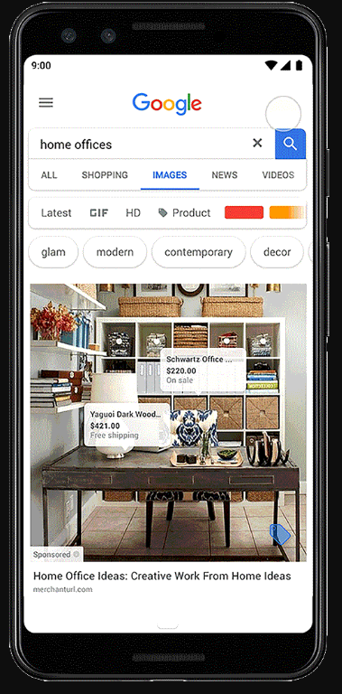 Zonde dus om niet méér met Google Afbeeldingen te doen – wat overigens al sinds december 2001 bestaat – moet Google eindelijk gedacht hebben. Daarom komt Google met Shoppable ads voor Google Afbeeldingen, waarbij je direct producten kunt shoppen in een afbeelding, alsof je door een showroom loopt. Het is winkelen in een foto. De gebruiker ziet informatie zoals prijs en merk bij de ‘shoppable’ producten staan door op het prijskaartje rechts onderaan de foto te klikken. Een gebruiker die interesse heeft in een product, kan op het product in de foto klikken en wordt doorverwezen naar de webshop. Google Shopping voor Google Afbeeldingen ziet er zo uit: