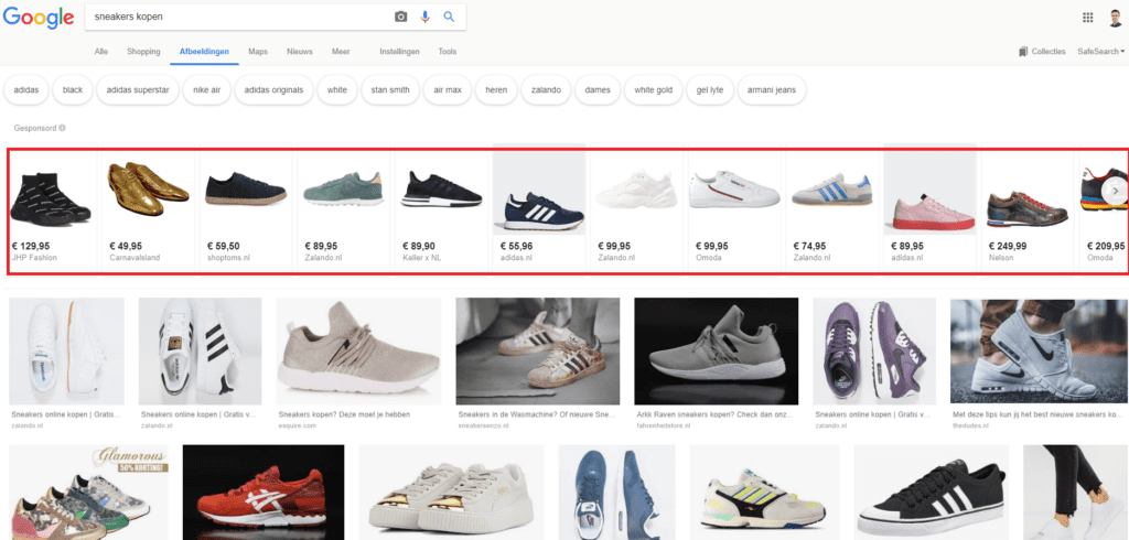 Rood omlijnd Google Shopping-advertenties zoals weergegeven in Google Afbeeldingen