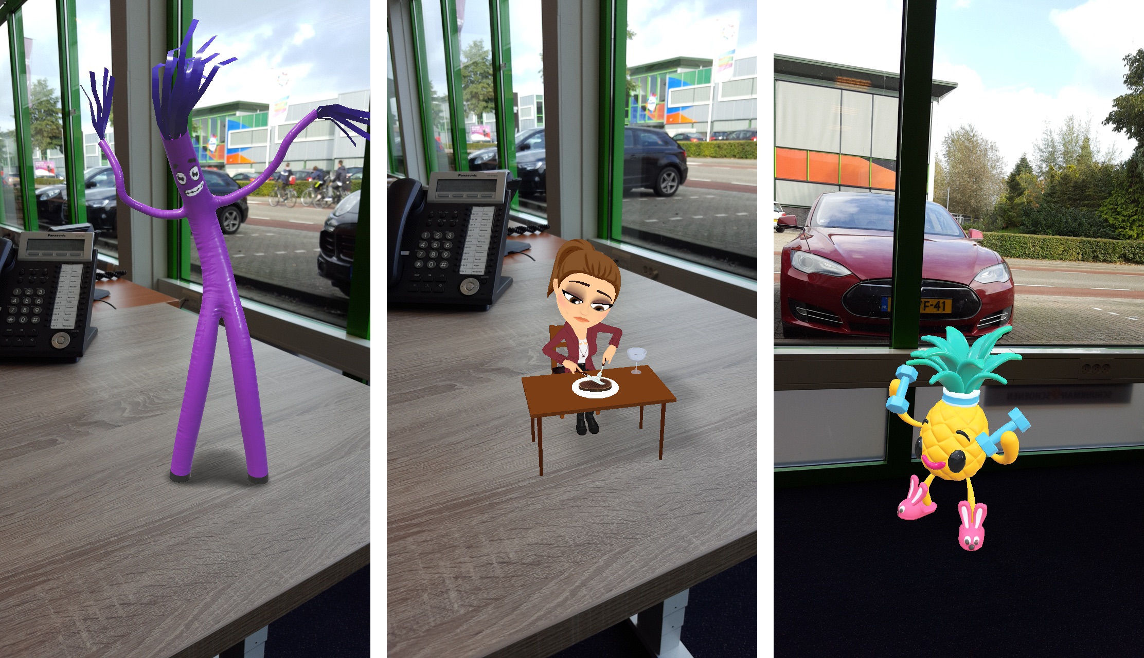 Op dit moment heeft Snapchat ook World Lenses met je eigen Bitmoji (je virtuele persoonlijkheid) en andere karakters zoals een sportende ananas en een opblaaspop: