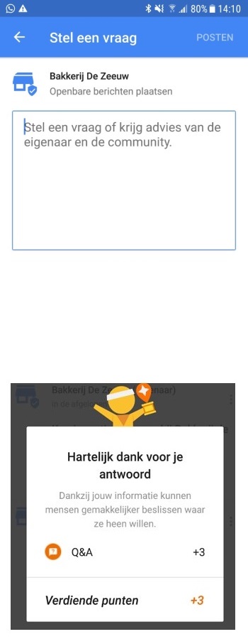 Niet alleen bedrijven, maar ook mensen die meedoen met het Local Guides programma kunnen vragen beantwoorden. Zodra iemand uit de community een vraag over jouw bedrijf beantwoordt, ontvang je hier als eigenaar een melding over.