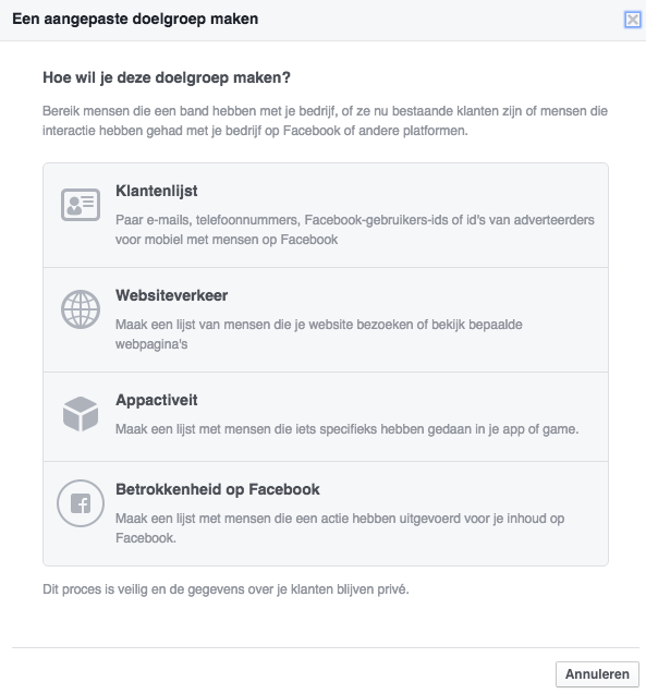 Naast de ‘gewone’ targetingmogelijkheden heeft Facebook een aantal extra functies waarmee je Facebook-campagnes naar een hoger niveau kunt brengen. Onder het kopje ‘Aangepaste doelgroepen’ gaat er een wereld aan extra mogelijkheden open. Zo was het al langer mogelijk om klantenlijsten toe te voegen, op basis van telefoonnummers of e-mailadressen. Erg handig om daarmee bestaande klanten in beeld te brengen, te ontdekken of ze ook actief zijn op Facebook en je product of merk (opnieuw) onder de aandacht te brengen bij deze groep.