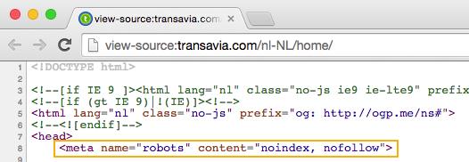 @N. van Doorn: Tijdens de ontwikkeling van een website wordt er meestal gebruik gemaakt van noindex en nofollow. Zo voorkom je dat de testversie in Google wordt opgenomen. In het geval van Transavia zijn per ongeluk de noindex en nofollow instellingen doorgezet naar de live omgeving.
