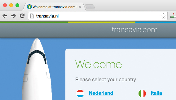 Naast www.transavia.com is het ook mogelijk om www.transavia.nl te bezoeken. Hier wordt een introscherm getoond waarbij de mogelijkheid is om voor Nederland te kiezen.