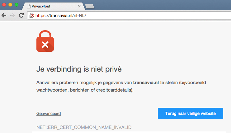 Bij het klikken op Nederland wordt er een privacyfout melding getoond. De afbeelding laat zien dat ‘https://’ niet goed wordt doorverwezen, waardoor Google de website als onveilig beschouwt.