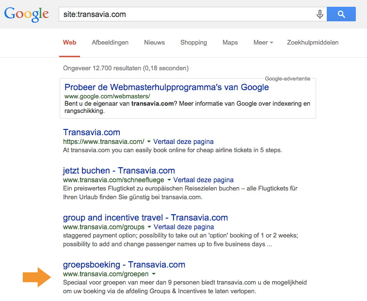 In Google heb je de mogelijkheid om ‘site:transavia.com’ als zoekdopdracht uit te voeren. Google geeft de melding dat er 12.700 pagina’s van dit domein zijn geïndexeerd.
