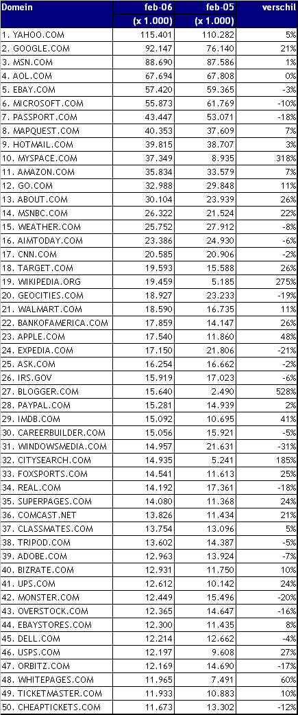 Uit de meest recente cijfers van ComScore Media Metrix blijkt dat de grootste internetmerken als Yahoo, Google en MSN nog steeds de meeste bezoekers trekken. Yahoo.com registreerde in februari 2006 maar liefst 115 miljoen bezoekers. Toch lijkt het er op dat de ‘traditionele’ internetmerken niet of nauwelijks meer groeien. De enige uitzondering daarop is Google dat met een toename van 21% ten opzichte van vorig jaar nog een significante groei laat zien. Sociale netwerken zoals Blogger.com, MySpace.com en Wikipedia.org daarentegen laten een forse groei zien. Blogger.com groeide in een jaar maar liefst 528% en registreerde ruim 15,6 miljoen bezoekers in februari 2006. Washingtonpost spreekt dan ook van een nieuwe trend in online traffic.