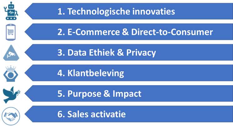 Het onderzoek, of beter, de verkenning dus, leverde een schat aan informatie op die weer leidde tot een serie aanbevelingen over marketingonderwijs. Om structuur aan te brengen – tenslotte is marketing voor veel mensen ook een soort ‘mening’ – hebben de onderzoekers eigenlijk twee paden bewandeld. Allereerst is de blik naar buiten gericht. Op basis van een analyse van rapporten, trendanalyses en expertinterviews zijn relevante trends en ontwikkelingen met betrekking tot de toekomst van de marketing geïnventariseerd. Daarin kwamen de zes thema’s naar voren: