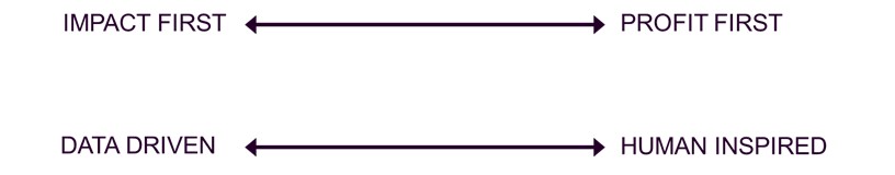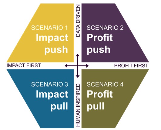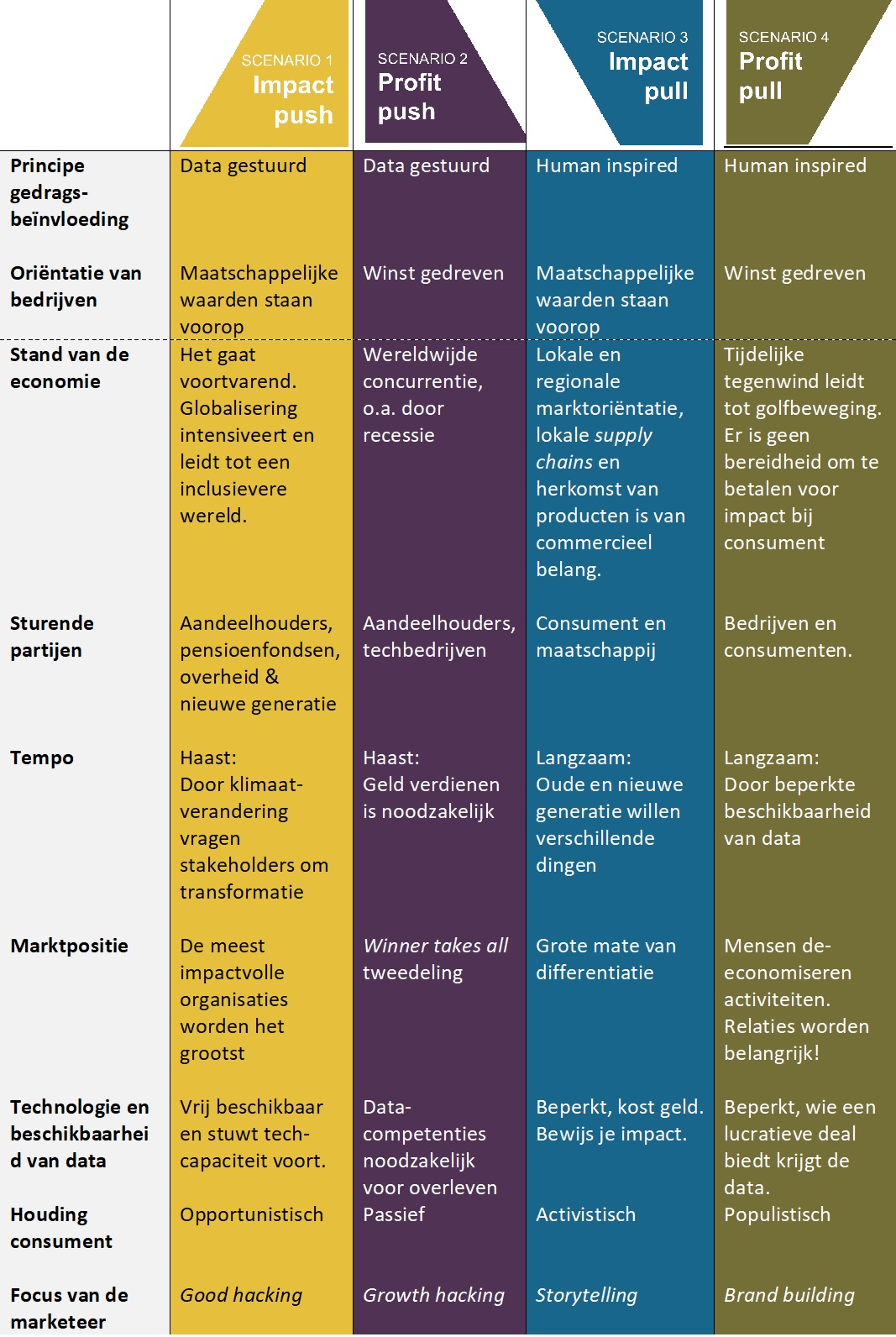 De vraag is welke kant het vak bedrijven op bewegen en dus het vak. Op zich sluiten de tegenstellingen elkaar niet uit, maar ze lijken verschillende richtingen op te bewegen: Die tussen profit en purpose gaat over de oriëntatie van organisaties. Die tussen data en human gaat over het leidend principe voor gedragsbeïnvloeding. Als je ze in een matrix zet leidt dat tot scenario’s. Op zich geen wensbeelden of voorspellingen. Scenario’s mogen zelfs een beetje karikaturaal zijn maar ze zijn bedoeld als instrument om gedachten op te rekken en voorstellingen te maken van mogelijke kansen en uitdagingen die in het verschiet liggen.