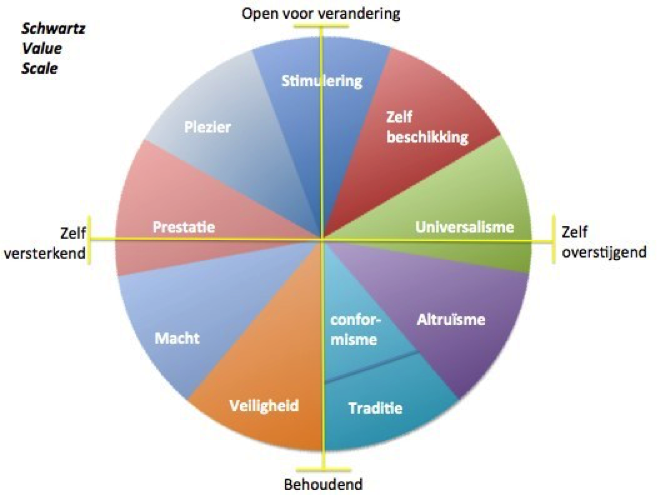 Bovenstaande positioneringen verwijzen allemaal naar menselijke waarden. Dat zijn kort gezegd belangrijke levensdoelen die universeel leidend zijn voor de attitudes en acties van mensen (Schwartz, 2012).