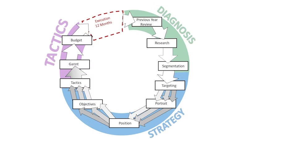 Marketingdiagnose of – analyse is een onderschat onderdeel van het marketingberoep. Het komt ook steeds terug en gaat nog wat verder dan ‘brand diagnosis’ alleen trouwens. Daarom hamert Ritson vaak op zijn schematische voorstelling van een marketingproces: Eerst stel je een diagnose, daarna komt de marketingstrategie en ten slotte volgt een planning, met daarin de ‘tactics’. En terwijl je bezig bent met al die tactische handelingen vult zich de database met een deel van nieuwe gegevens om weer te gebruiken bij de volgende analyse:
