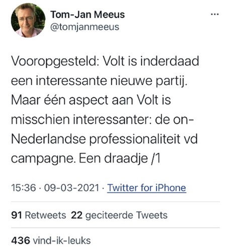 Dat laatste denk ik niet. Tom Jan Meeus, die ik wekelijks met plezier lees in het NRC (als onderdeel van mijn filterbubbel), noemde de campagne van Volt ‘on-Nederlands professioneel’. Een echte verklaring kan hij er niet voor geven, behalve dat deze nieuwe partij al vroeg en heel slim verschillende journalisten had benaderd en ook online al lang actief was. Volt is er er dus in elk geval in geslaagd om veel earned media te genereren door een overzichtelijk inhoudelijk Europees programma consequent over de bühne te brengen. Al ver voor de verkiezingen. D66 hamerde ook continu op een vast aantal thema’s met heldere uitleg, die vervolgens omnichannel overal te zien en te horen was. Daar ging het bijvoorbeeld mis bij GroenLinks. Dat leed niet alleen door een gebrek aan een duidelijke positionering, maar was ook niet inhoudelijk genoeg. Of zoals columnist Marcel van Roosmalen het verwoordde: “GroenLinks heeft de eigen kiezers met een windturbine weggeblazen. Met de slogan ‘Meer toekomst, meer GroenLinks’ voel je ook de leegte van een holle frase.”