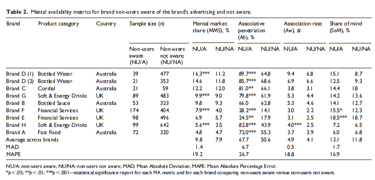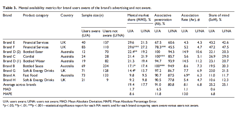 In het onderzoek werd nagegaan of er wetmatigheden en consistente patronen te ontdekken zijn ten aanzien van de vier componenten van mentaal marktaandeel in verschillende product-/marktsituaties? Overigens werd rekening gehouden met verschillen tussen merkgebruikers en niet-merkgebruikers. De reden hiervan is dat merkgebruikers per definitie altijd hoger scoren op deze metrics omdat het gebruik van merken dit effect heeft. Dit wordt ook wel ‘usage bias’ genoemd en daar moet je bij de uitkomsten rekening mee houden anders schat je de effecten van reclame verkeerd in. Uiteraard werd eerst bij iedereen gemeten of zij zich zich de juiste reclame van de merken konden herinneren.