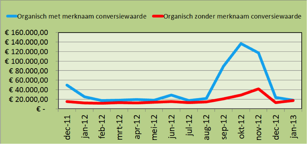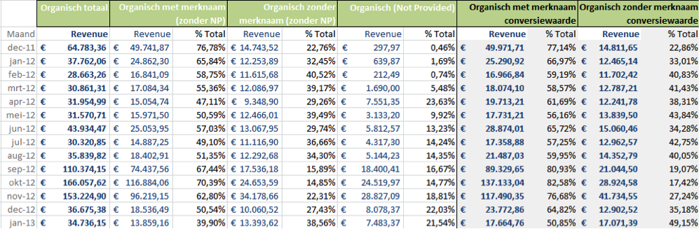 In de laatste twee kolommen zie je de geëxtrapoleerde opbrengsten toegekend aan (not provided)-bezoeken verwerkt in organisch met merknaam en organisch zonder merknaam. Ik heb hier nu de opbrengsten berekend, maar je kunt dit ook met het aantal bezoekers doen of met doelwaarde als je dit hebt ingesteld in Google Analytics.