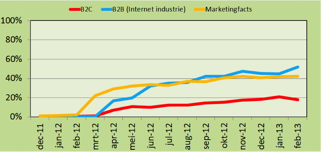 Zoals we zien valt het percentage binnen B2C (zoals het lijkt) mee met de laatste maanden gemiddeld 20% (not provided)-resultaten. Bij B2B-websites zit het percentage (not provided) echter al boven de 50%. Hier op Marketingfacts liep (not provided) begin 2012 snel op en op dit moment bestaat iets meer dan 42% van het organische verkeer uit de afgeschermde zoektermen.