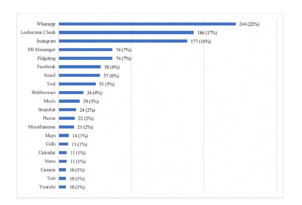 De meest frequente smartphoneactiviteit was het gebruik van WhatsApp, gevolgd door het controleren van het vergrendelde scherm en Instagram. Telefoongesprekken, sms-berichten en Maps maakten elk slechts 1 procent uit van de totale steekproef.
