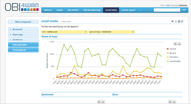 Er zijn diverse selecties beschikbaar waaronder share of buzz, case-owner, sentiment, onderwerpen, tags, status, etc. Dit is slechts een selectie van de mogelijke statistieken.