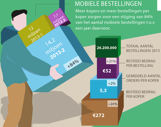In de tweede helft van 2013 zijn ruim 14 miljoen bestellingen gedaan via mobiele apparaten, een groei van 84 procent ten opzichte van dezelfde periode in het jaar daarvoor. In totaal zijn in 2013 ruim 26 miljoen online bestellingen gedaan via een smartphone of tablet. Consumenten doen ook steeds vaker grote of dure aankopen mobiel. Zij besteedden in de laatste zes maanden van het jaar gemiddeld 52 euro per bestelling; 21 procent meer dan in 2012. De betaling van de mobiele aankopen wordt, net als online, voornamelijk met iDEAL gedaan.