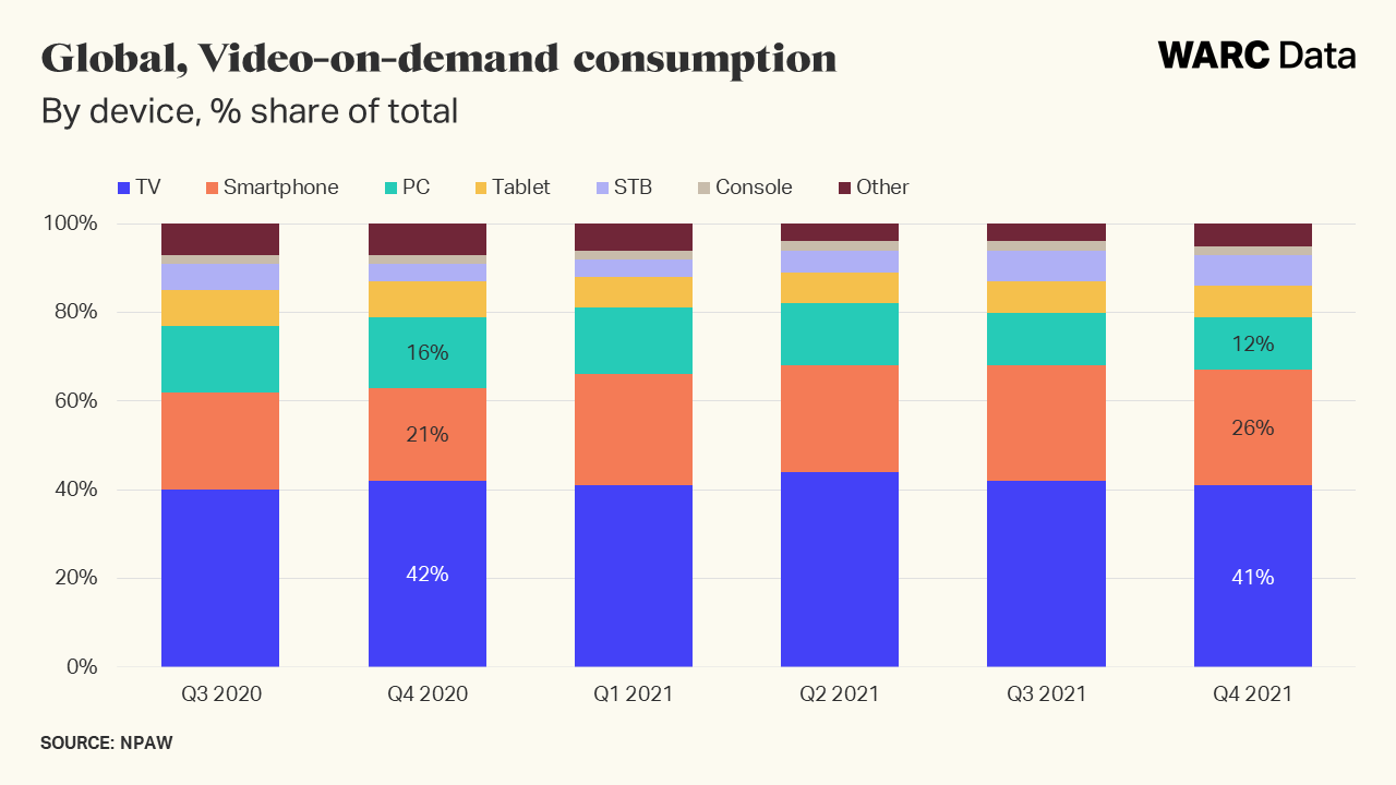Kijken op een laptop of zelfs desktop gebeurt steeds minder vaak: PC-video-on-demand-consumptie staat nog op de derde plaats, maar zag de grootste daling, met 12% in het vierde kwartaal van 2021. Voor merken die digitale video gebruiken, kan de populariteit van het delen van accounts een aantal uitdagingen met zich meebrengen als het gaat om targeting en personalisatie. Ook het brede aanbod aan platformen, met een publiek van gemiddeld vijf personen, kan een uitdaging zijn.