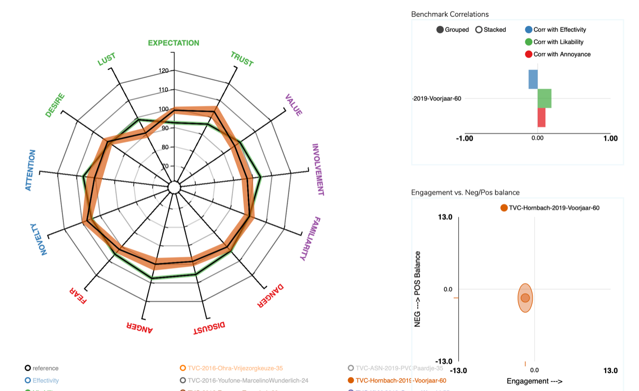 Als je de spingrafiek van de hersendata bekijkt, dan zie je bovenin in het groen de positieve emoties die we meten in het onderbewuste, onderin in het rood de negatieve emoties, links de impact en rechts de betrokkenheid. De groene lijn is de benchmark die is opgebouwd uit meer dan zeventig Gouden Loeki’s. De oranje lijn is de meting van deze commercial. De halo is de zo genoemde standaardfout.