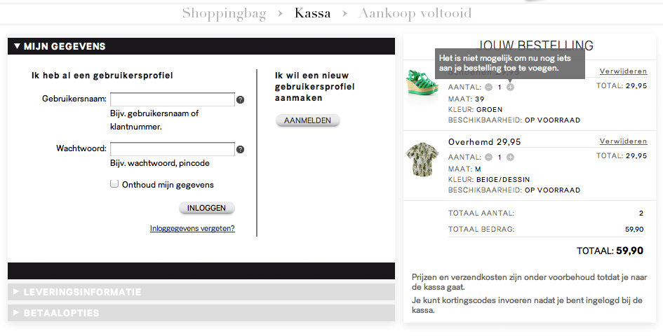 http://hm.com: zowel boven als onder wordt het logische verloop van het proces duidelijk gemaakt. Vreemd detail: aantal lijkt aan te passen maar bij een mouse-over blijkt van niet.
