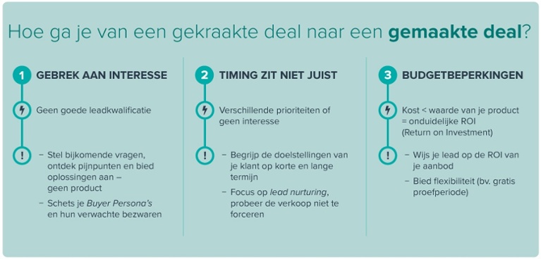 Er zijn onnoemelijk veel bezwaren te verzinnen waar de lead tijdens onderhandelingen mee komt, in de infographic hieronder hebben we de drie meest voorkomende gezet inclusief tips hoe je van een dealbreaker een dealmaker maakt.