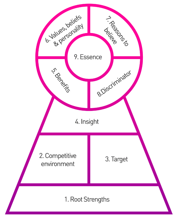 Het brandkey-model benadert de wereld van buiten naar binnen. Het plaatje spreekt eigenlijk al voor zich. Je begint bij de Root Strenghts: de historische kracht van je merk waar je op kunt voortbouwen. Vervolgens analyseer je de externe wereld: je concurrentie en je doelgroep. Speel vervolgens in op een relevante ‘customer insight’, wat verwijst naar een latente aankoopmotivatie. In stap 5, 6, 7 en 8 kijk je naar de interne wereld. Je analyseert de voordelen, waarden en persoonlijkheid, geloofwaardigheid en onderscheidende kracht. In stap 9 kom je tot de merkessentie waarbij je in één of twee woorden de essentie van het merk benoemt.
