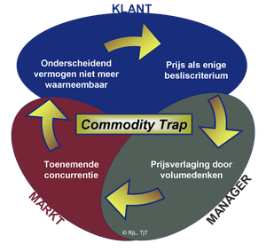 Het allergrootste pijnpunt dat ik tegenkom in B2B is dat bedrijven zich willen onderscheiden op het niveau van proposities (product/service), maar hierin snel worden ingehaald door concurrenten. Met als gevolg dat je geen onderscheidend vermogen meer biedt. Je past dus je prijs of uurtarief aan, zodat de klant wél voor jou kiest. Deze kortetermijnacties zorgen ervoor dat de prijs onder druk komt te staan en uiteindelijk je marges. En dan? Dan is er geen investeringsruimte meer. En zo gaat het cirkeltje rond. Dit noem je ook wel de ‘commodity trap’. Ben jij er al in getrapt?