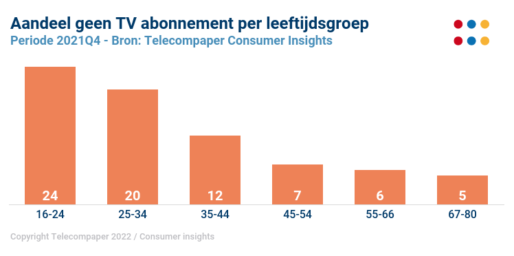 Een op de vijf huishoudens met gezinsleden onder de 35 jaar heeft geen tv-abonnement. Dit blijkt uit het nieuwste Video Behaviour Dutch Consumers-rapport van Telecompaper over het vierde kwartaal van 2021.