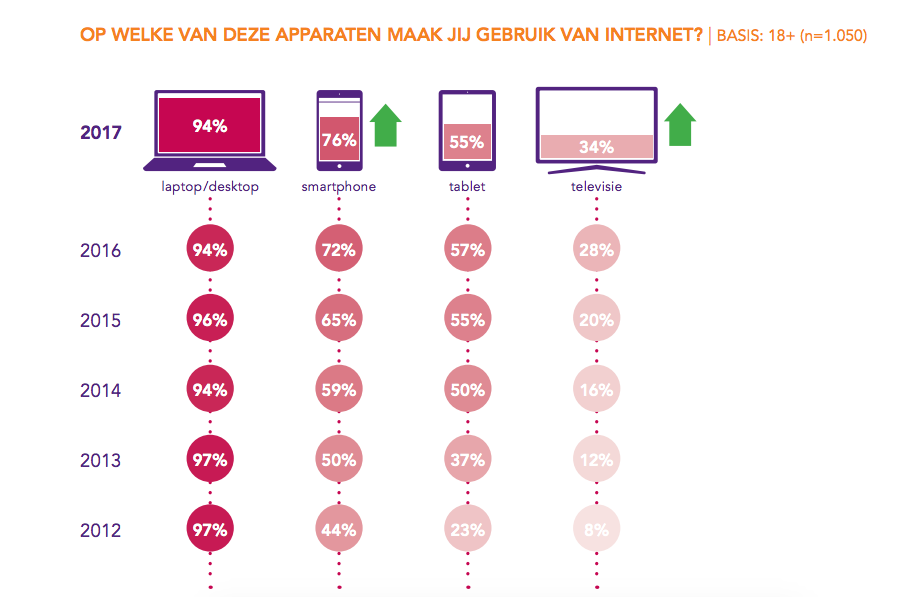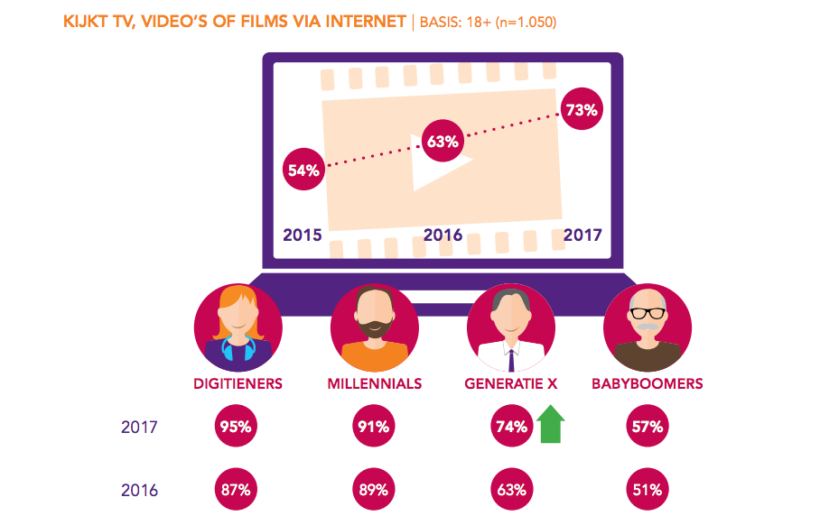 Inmiddels kijkt een ruime meerderheid van de Nederlanders naar tv, video’s of films via internet. Bijna alle digitieners en millennials kijken online video en ook de oudere generaties weten het online kanaal voor tv steeds meer te vinden. In 2017 kijken Nederlanders vaker online tv via de laptop of desktop, via televisie en via de smartphone dan in 2016.