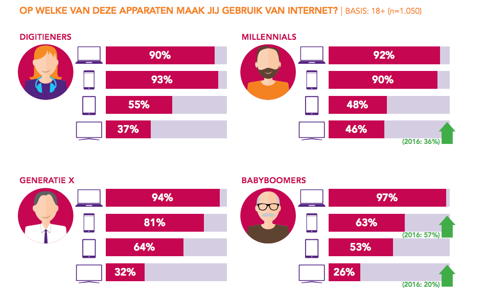 Anno 2017 heeft ook een ruime meerderheid van de babyboomers de smartphone geadopteerd. Generatie X gebruikt de tablet het meest van alle generaties. Daarnaast valt op dat onder deze generatie en onder babyboomers het gebruik van de tablet redelijk dicht in de buurt komt van dat van de smartphone. In de jongere generaties is juist het tegenovergestelde waar.