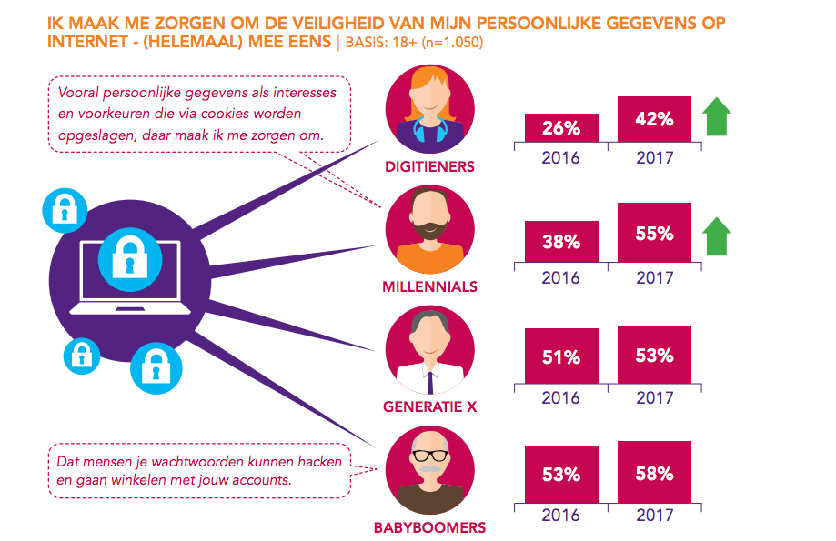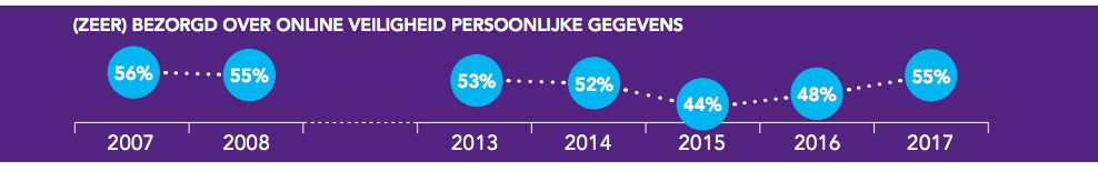 54 procent maakt zich zorgen over de ‘sporen’ die zij op het internet achterlaten. Dan hebben we het over adresgegevens en bankzaken, wachtwoorden en online gedrag zoals zoekgeschiedenis en bezochte websites. Daarnaast maken Nederlanders zich zorgen over de zichtbaarheid van foto’s, likes en comments op social media en (gedeelde) locaties.