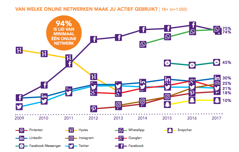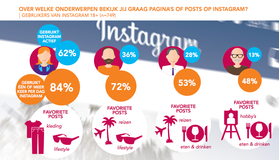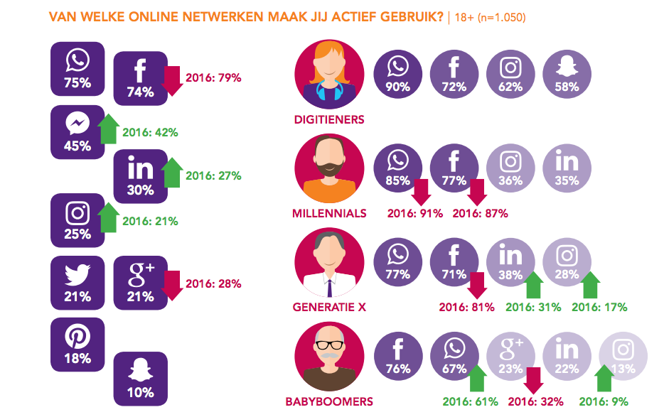 Het gebruik van Facebook daalt voor het eerst. Ondanks de daling in gebruik, hebben nog steeds veel Nederlanders een account bij Facebook. Millennials en generatie X zijn vooral verantwoordelijk voor die daling: het actieve gebruik van Facebook is bij millennials gedaald van 85 procent naar 77 procent. In tegenstelling tot Facebook, zit het gebruik van Instagram (ook eigendom van Facebook) flink in de lift. Een op de vier Nederlanders noemt zichzelf inmiddels een actieve gebruiker van dit netwerk. Opvallend is dat de stijging in het gebruik van Instagram uitsluitend in de oudere generaties zichtbaar is, vooral in generatie X is het gebruik flink toegenomen.