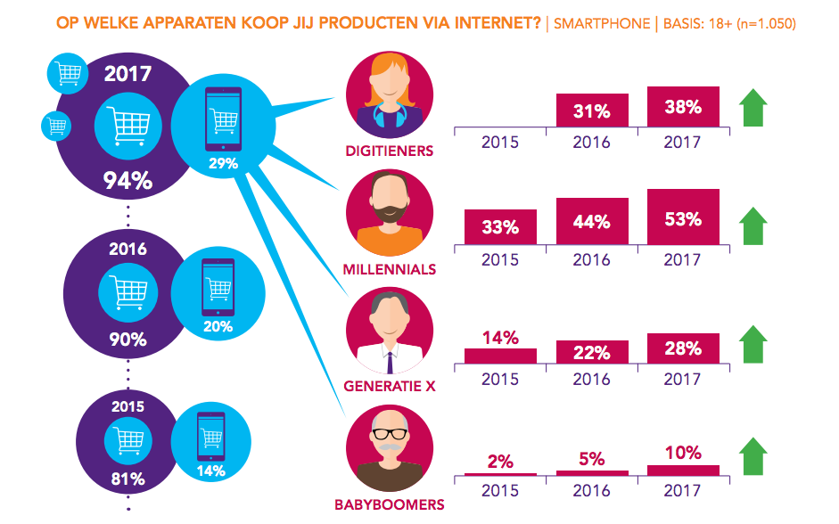 Met de blijvende toename van het aantal smartphones en steeds meer websites die echt mobile-proof zijn, is het geen verrassing dat ook m-commerce groeit. Inmiddels kopen drie op de tien Nederlanders wel eens wat via hun smartphone. In alle generaties zien we een toename; zo is het aantal babyboomers dat wel eens mobiele bestellingen doet verdubbeld ten opzichte van vorig jaar.