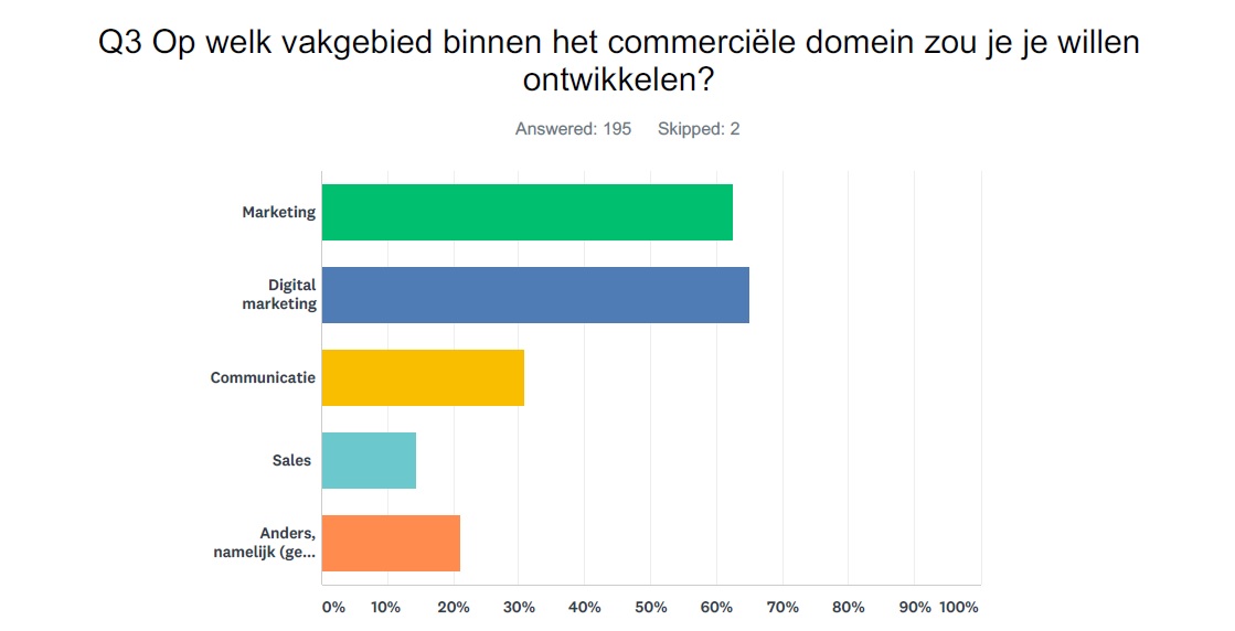 Ruim een kwart van de respondenten wil dat zelfs al binnen een half jaar doen, waarbij moet worden aangemerkt dat daarbij niet expliciet is gevraagd naar de aard van die opleiding: kort of lang, intensief of meer vrijblijvend. Een ‘pakweg NIMA B-opleiding’ valt onder ‘lang en intensief’. Slechts een kwart van de ondervraagde marketeers gaf onomwonden toe helemaal géén plan te hebben om op korte termijn een opleiding of cursus te volgen. Opvallend laag eigenlijk. Ruim 30 procent van de respondenten wil zich breder ontwikkelen in Communicatie, bijna 15 procent in Sales.