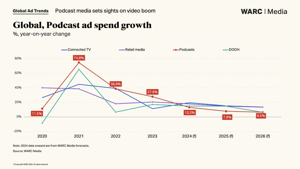 Volgens schattingen van Warc Media zullen de uitgaven aan podcastadvertenties in het VK dit jaar naar verwachting £ 110 miljoen bedragen, met een groei van 12,8%. Dit is een snellere groei dan in de VS en een scherpere stijging dan voorspeld voor de Britse uitgaven aan search, social media, DOOH en BVOD in 2025. Het bereik van podcasts in het Verenigd Koninkrijk neemt toe: een vijfde (23,6%) van de mensen van 15-24 jaar luistert minstens één podcast per week en de consumptie is het hoogst onder 25-34-jarigen (27,9%).