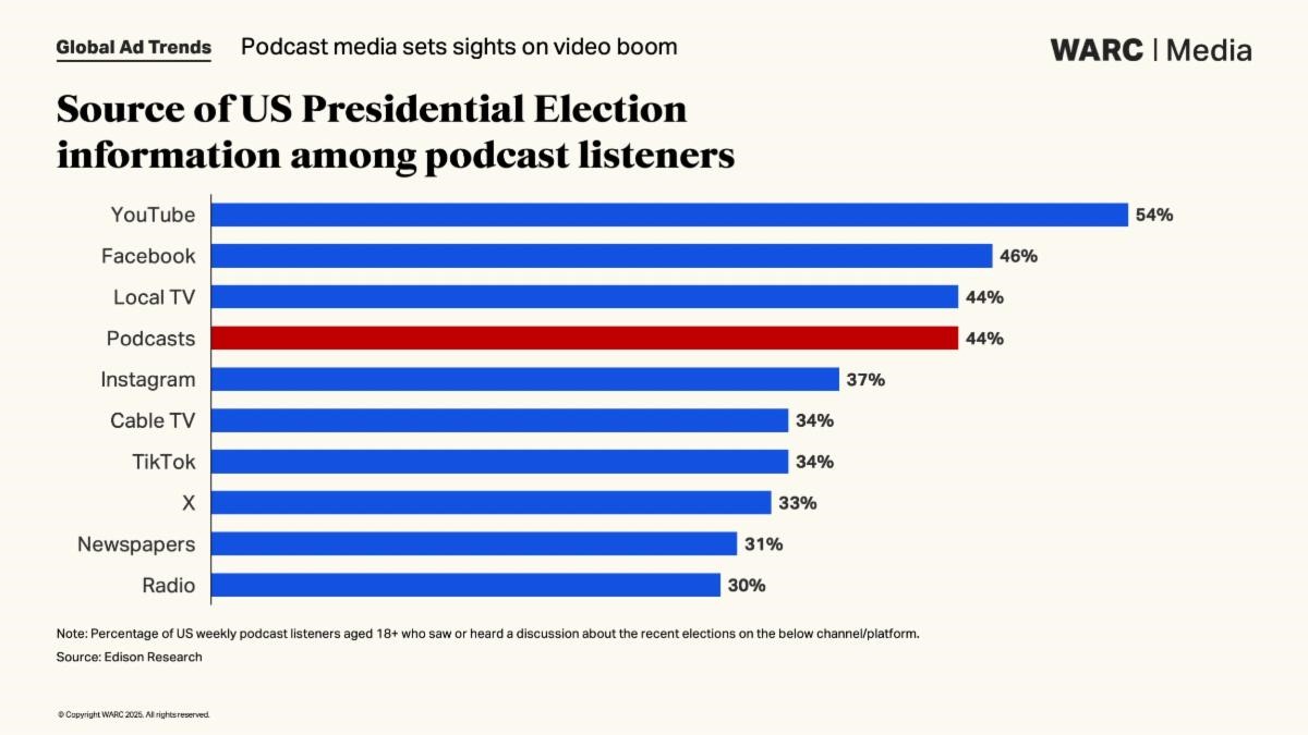 Volgens Edison Research gaf bijna de helft (44%) van de ondervraagden aan dat ze informatie over de Amerikaanse verkiezingen uit podcasts haalden, vóór kabeltelevisie (34%) en platforms zoals X (33%).