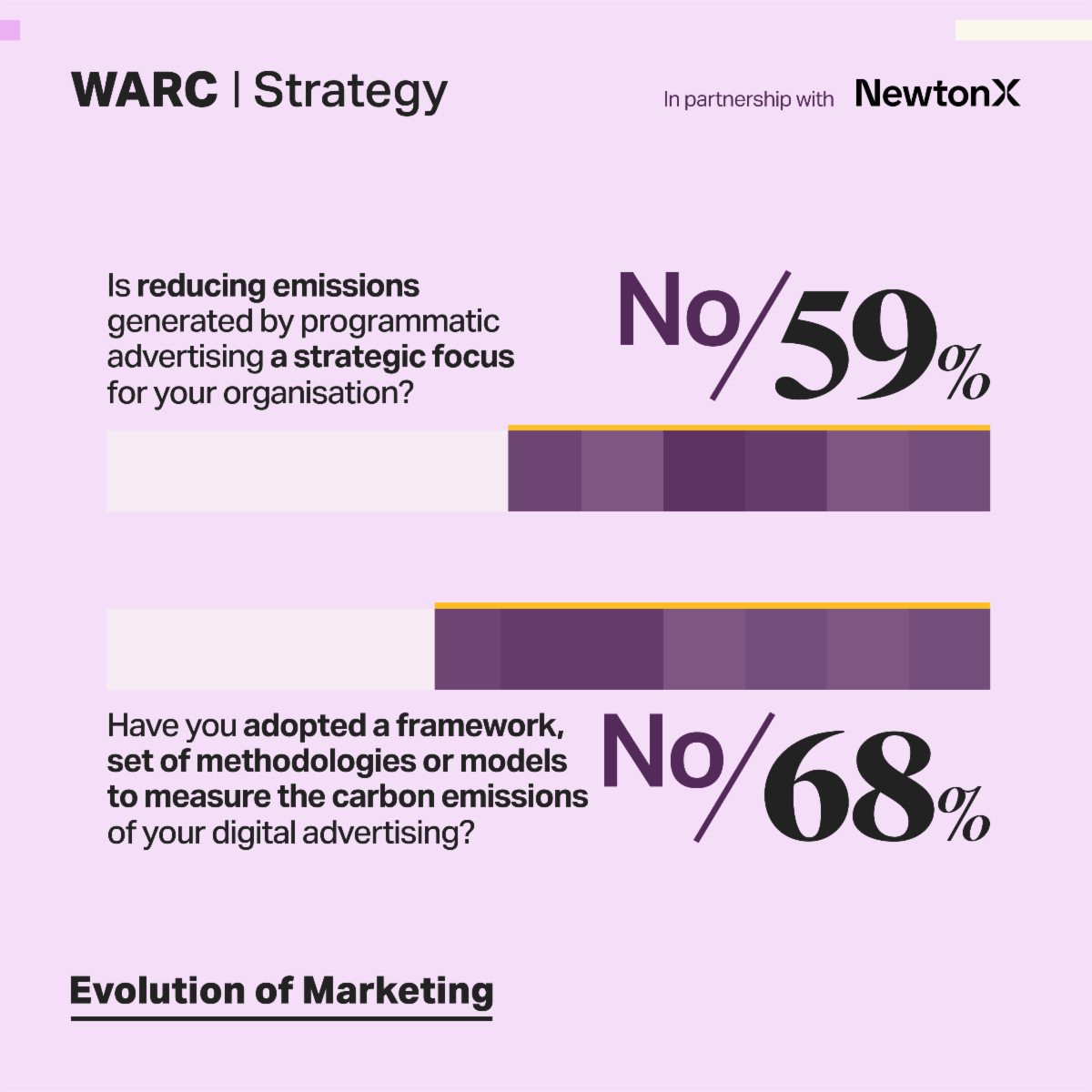 Om de klimaatcrisis te helpen aanpakken, moeten marketeers meer verantwoordelijkheid nemen voor het verkleinen van de CO2-voetafdruk van onder meer programmatic advertising, maar helaas is emissiereductie is bij de meeste (59%) bedrijven geen prioriteit. Meer dan de helft (52%) van de ondervraagden noemt een gebrek aan sectorbrede normen een barrière en bijna de helft (48%) wijst op een gebrek aan kennis/vaardigheden rond het verkleinen van de CO2-voetafdruk van reclameactiviteiten. Mark Andrews, Senior Consultant bij ID Comms: ‘Sommige adverteerders gebruiken hun mediabureaus om de CO2-uitstoot te voorspellen op basis van hun mediaplannen. Dit leidt planners en inkopers op en helpt mediateams na te denken over de CO2-uitstoot en na te denken over hoe praktische beslissingen in de planningsfase de uitstoot kunnen verlagen, zonder de effectiviteit van mediaplanning/inkoop negatief te beïnvloeden.’