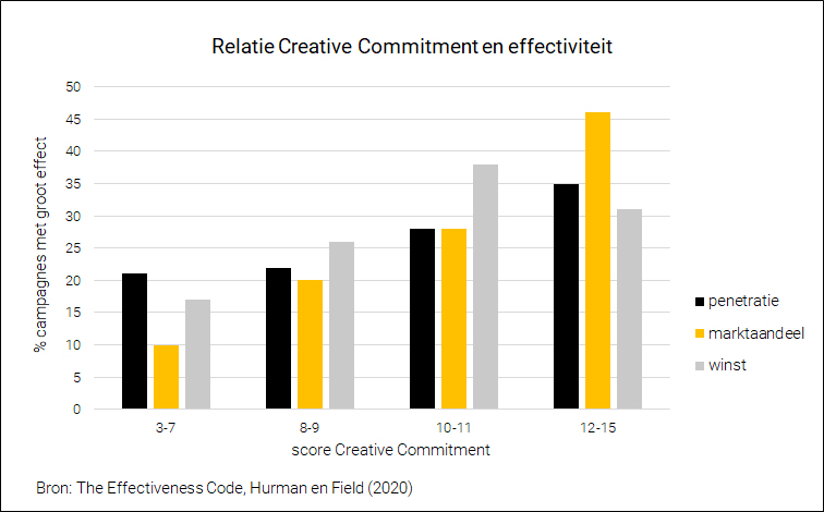 Analyses op de databases van Cannes Lions, WARC en de IPA laten zien dat een hogere score op creative commitment inderdaad samenhangt met grotere effectiviteit. Creative commitment hing bijvoorbeeld samen met grotere groei in penetratie, marktaandeel en winst (zie grafiek). Zoals Hurman en Field het samenvatten: bigger campaigns, produce bigger effects.