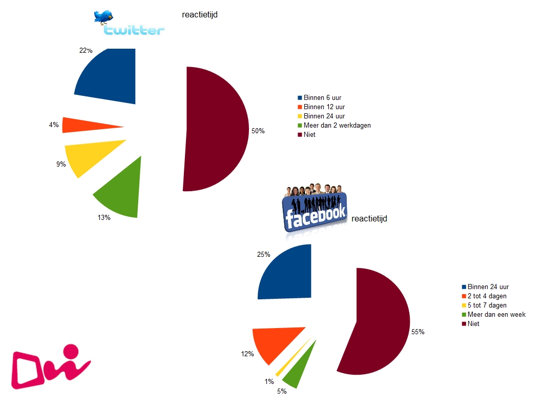 Meer dan de helft reageert dus niet, maar als er gereageerd wordt, is dit meestal wel snel. Bij Twitter is de verwachting van mensen, in onze optiek als onderzoekers, dat er een hogere reactiesnelheid is, dus lag de lat daar ook hoger. Toch weet 22% binnen 6 uur te reageren, wat een absoluut keurig percentage is. Bij Facebook weet 25% binnen een dag te reageren. Slechts 5% doet er meer dan een week over, bij Twitter deed 13% er meer dan 2 dagen over.
