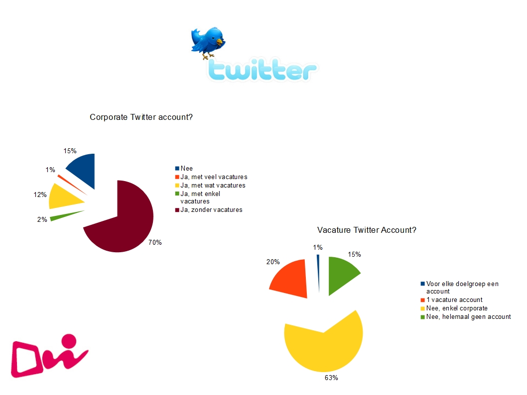 Wat ook opvalt is dat afdelingen lijken te regeren op social media. Van alle corporate Twitter-accounts heeft de overgrote meerderheid geen vacatures ertussen. Marketing heeft Twitter en de rest van de organisatie heeft blijkbaar pech. Positief is dat de partijen die hier wel een combinatie van maken dat heel goed weten te doseren. Bij 1% waren het heel veel vacatures op het corporate Twitter-account (meer dan 30%), bij 2% heel beperkt (slechts enkele).