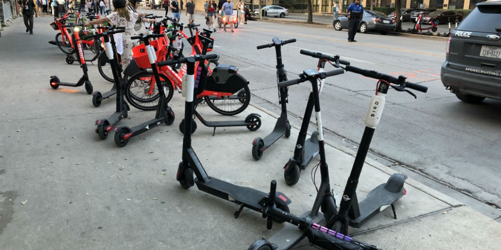 In januari had ik in Auckland al eens enthousiast gebruik gemaakt van zulke scooters, maar dat was één merk (Lime) en misschien in totaal zo’n achthonderd steps. In Austin lag het iets anders: maar liefst vijf bedrijven hadden elke step naar Austin meegenomen, die ze maar hadden kunnen vinden. In totaal zo’n achtduizend stuks! En dan maar concurreren.