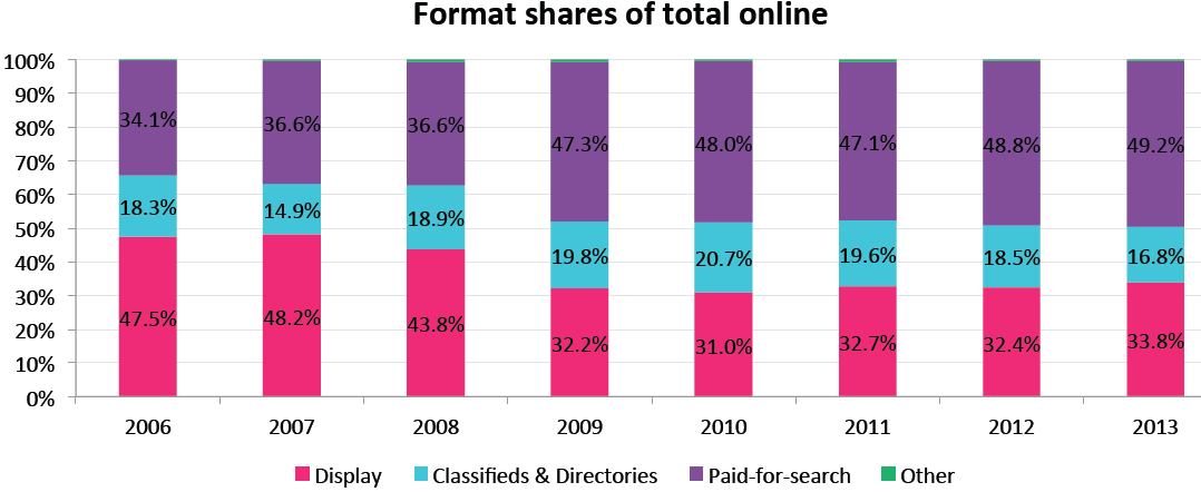Het florerende automatisch verhandelen van advertenties en de sterke groei van mobiel hebben ervoor gezorgd dat display advertising sterker is gegroeid dan search advertising. Display groeide in 2013 maarliefst met 14,9 procent, met een totale waarde van 9,2 miljard euro. De uitgaven aan zoekmachine-advertenties groeide hetzelfde jaar met 13 procent, waardoor het goed is voor 13,4 miljard euro.