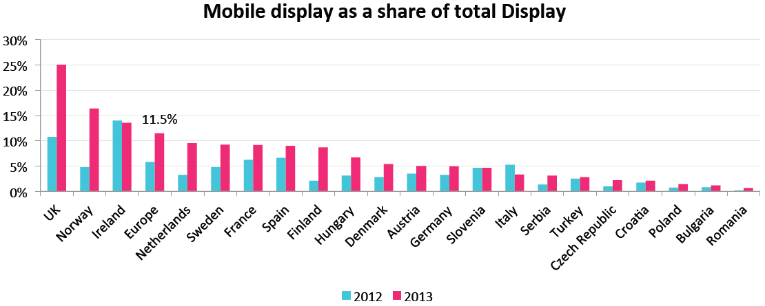 Mobiel was in 2013 goed voor 11,5 procent van de Europese online advertentiebestedingen. Dat is een groei van 128,5 procent ten opzichte van 2012. De Engelstalige landen drijven het Europees gemiddelde omhoog, met name Groot-Brittanië. Nederland scoort met 9 procent onder het Europees gemiddelde. De groei in Nederland in 2013 was echter sterk. Mobiel begon begin van het jaar met een aandeel van 3 procent, tegen het einde scoorde het double digits.