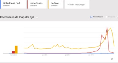 ‘Kill your darlings’ gaat niet alleen op voor schrijvers. Wellicht focus je als adverteerder al het hele jaar op een bepaalde productgroep, maar het kan best zijn dat je deze tijdelijk los moet laten. Er zijn nu eenmaal meer kapers op de kust. Via Google Trends kun je inzichtelijk maken wat het zoekvolume is naar bepaalde producten. Door informatie over interesses nu al vast te leggen kun je tijdens de feestdagen zo persoonlijk mogelijk adverteren. Waar is men naar op zoek? Zo zie je in onderstaande afbeelding bijvoorbeeld dat de zoekvolumes in 2014 naar Sinterklaas cadeau, Sinterklaas en cadeau gerelateerde zoektermen toenemen vanaf half oktober met een piek van eind november tot half december.