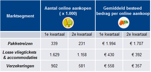 In bestedingen zijn er echter duidelijke verschillen tussen Q1 en Q2 te zien. In Q1 werd 3,7 miljard euro besteed aan online aankopen, in Q2 was dit 2,9 miljard euro. De grootste verklaring hiervoor is dat er in Q2 op totaalniveau minder aankopen zijn gedaan van diensten, en dan voornamelijk in de categorieën pakketreizen, losse vliegtickets & accommodaties en verzekeringen. Dit is grotendeels toe te schrijven aan seizoensinvloeden. Ook het gemiddeld besteed bedrag per online aankoop aan deze diensten ligt in Q2 lager dan in Q1. Dit samen zorgt ervoor dat de online bestedingen in de dienstensector, en daarmee ook de totale online omzet in het tweede kwartaal, wordt gedrukt ten opzichte van Q1.